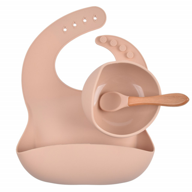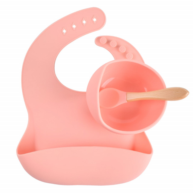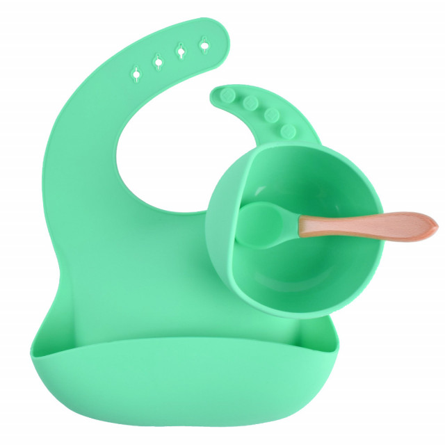Set din silicon cu bol bavetica si lingurita pentru bebe - diverse culori