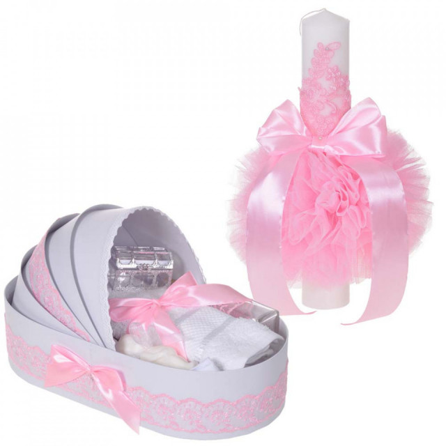 Set special creat pentru ceremonia de botez. Setul este alcatuit din trusou complet ambalat intr-o cutie tip landou si o lumanare decorata cu un glob din tul roz, dantela si fundita asortata.