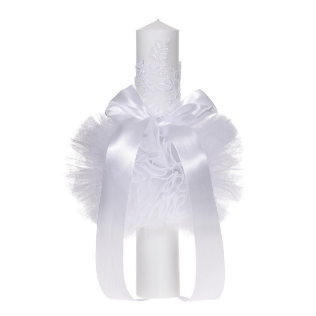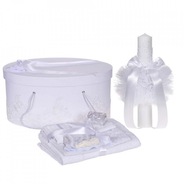 Set elegant trusou botez, cutie trusou si lumanare, decor dantela Alba diafana, Denikos® 961DESCRIERE