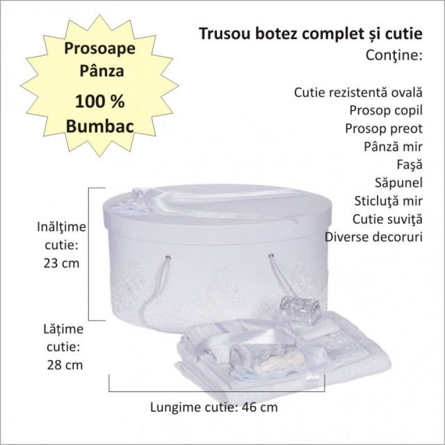 Set special creat pentru ceremonia de botez. Setul este alcatuit din trusou complet, o cutie pentru transportul trusoului si hainutelor de botez si o lumanare de botez decorata elegant cu dantela si fundita asortata.