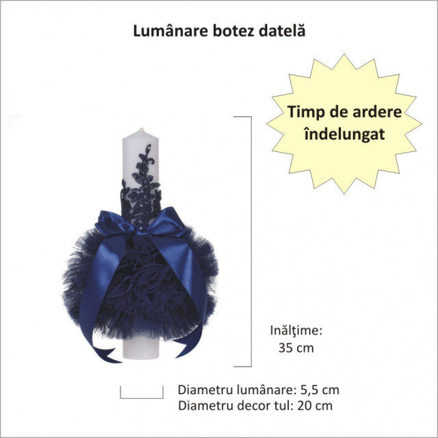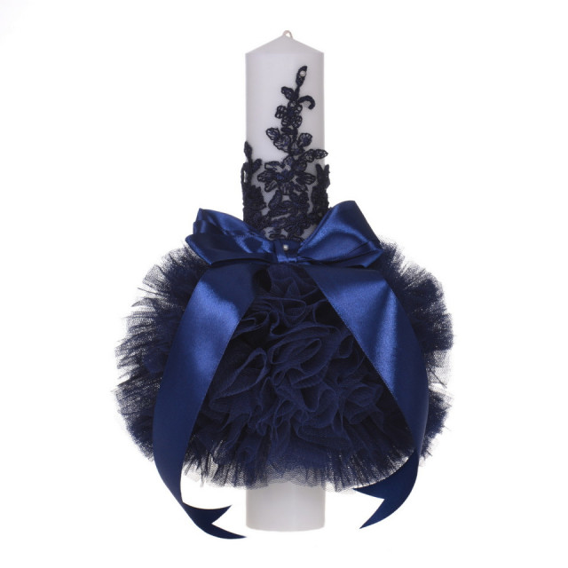 Set elegant trusou botez, cutie trusou si lumanare, decor dantela Bleumarin diafana, Denikos® 954DESCRIERE