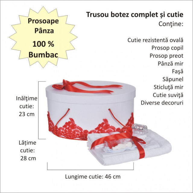 Set special creat pentru ceremonia de botez. Setul este alcatuit din trusou complet, o cutie pentru transportul trusoului si hainutelor de botez si o lumanare de botez decorata elegant cu dantela si fundita asortata.