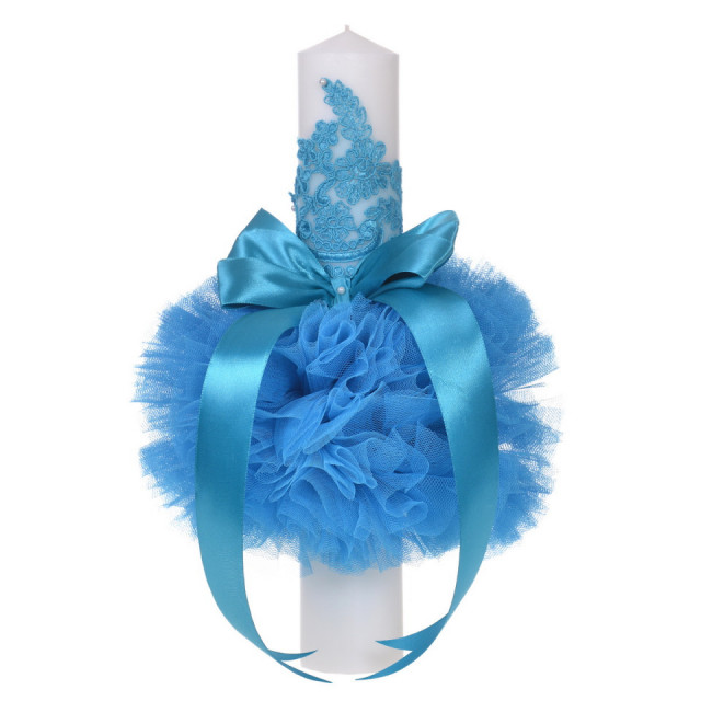 Set elegant trusou botez, cutie trusou si lumanare, decor dantela Turcoaz diafana, Denikos® 960DESCRIERE