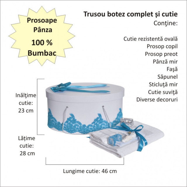 Set special creat pentru ceremonia de botez. Setul este alcatuit din trusou complet, o cutie pentru transportul trusoului si hainutelor de botez si o lumanare de botez decorata elegant cu dantela si fundita asortata.