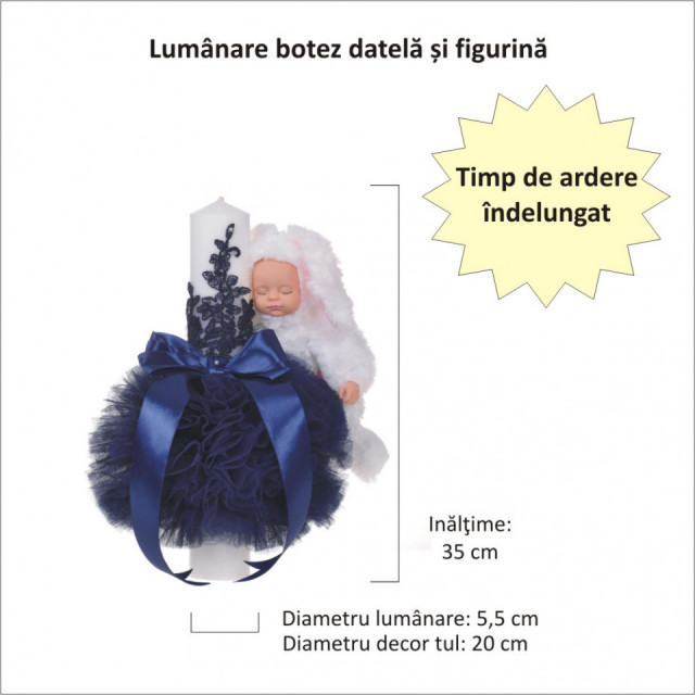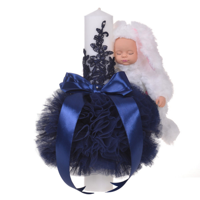 Set elegant trusou botez, cutie trusou si lumanare iepuras pufos, dantela si fundite, decor Bleumarin, Denikos® 927DESCRIERE