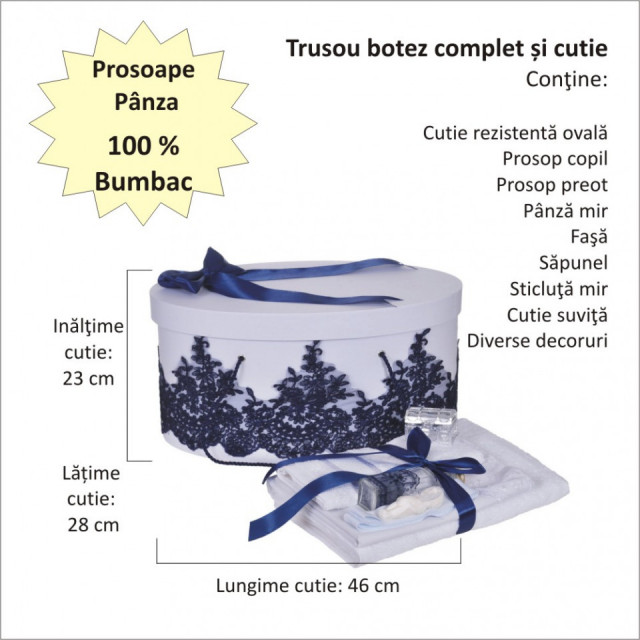 Set special creat pentru ceremonia de botez. Setul este alcatuit din trusou complet, o cutie pentru transportul trusoului si hainutelor de botez si o lumanare botez personalizata cu numele copilului si / sau data evenimentului decorata cu dantela eleganta si fundita asortata.