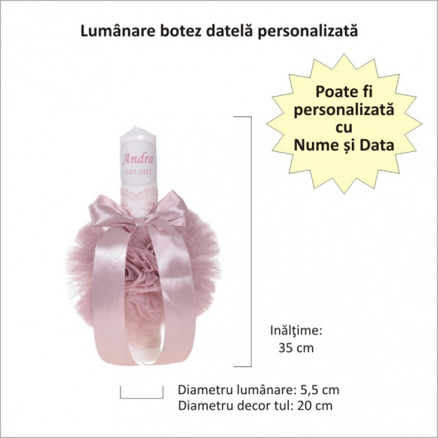 Lumanarea de botez este personalizata cu numele bebelusului si / sau data botezului / nasterii.