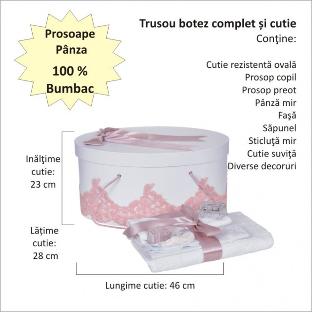 Set special creat pentru ceremonia de botez. Setul este alcatuit din trusou complet, o cutie pentru transportul trusoului si hainutelor de botez si o lumanare botez personalizata cu numele copilului si / sau data evenimentului decorata cu dantela eleganta si fundita asortata.