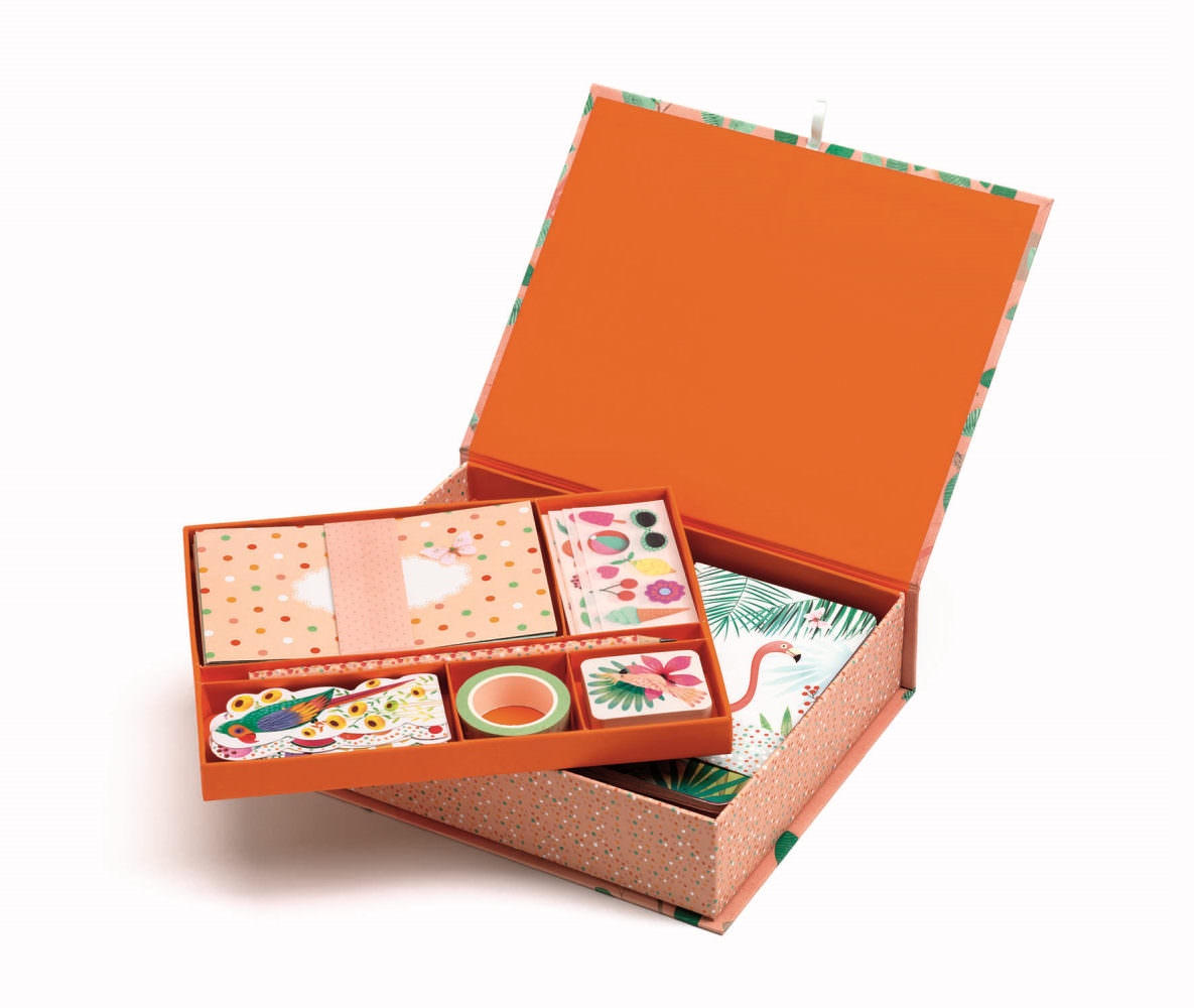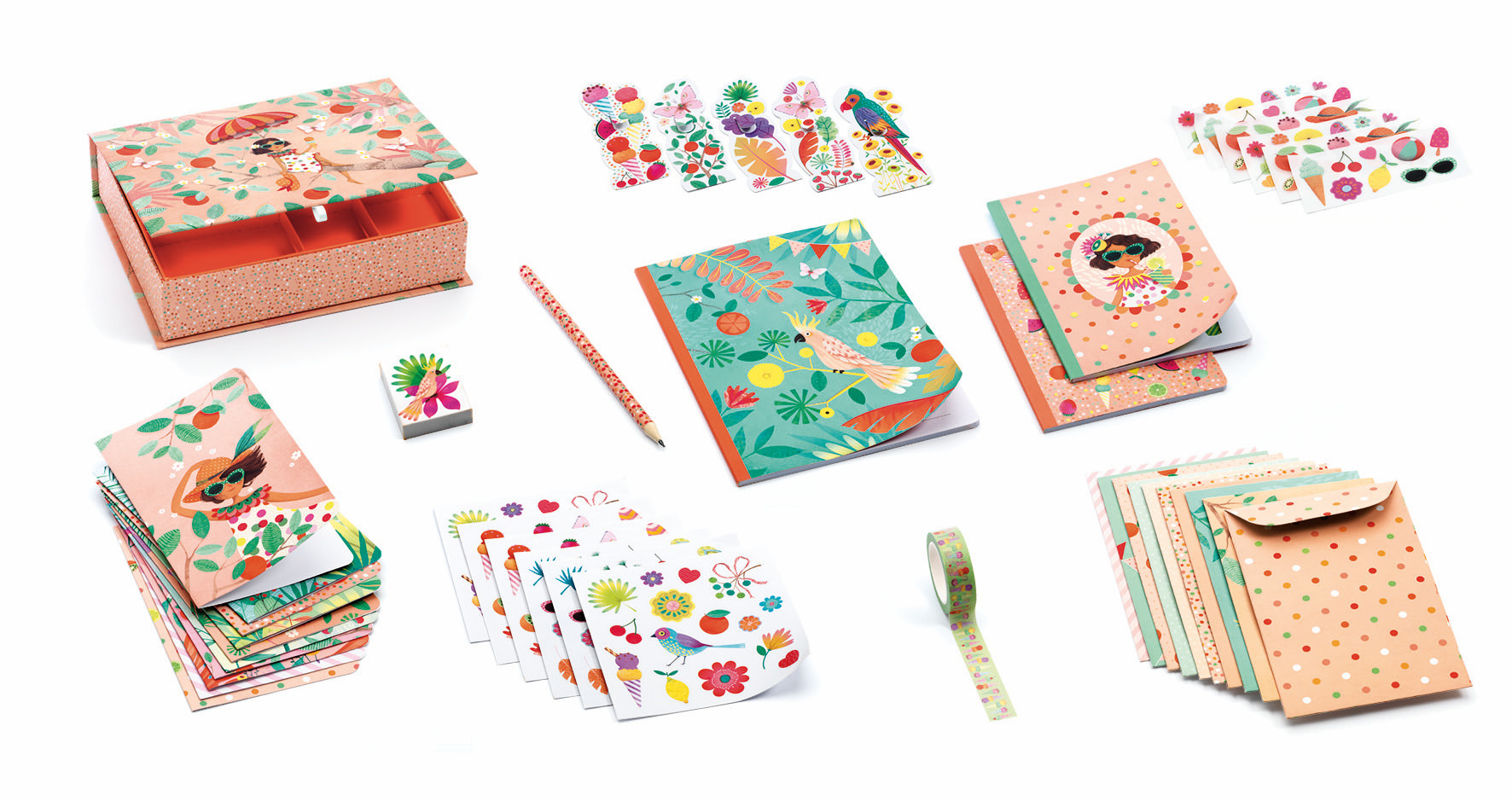 Conține 10 felicitări și 10 plicuri asortate, 6 coli cu decals (ilustrații care se tranferă prin răzuire), 5 semne de carte ilustrate, creion, radieră, rolă de bandă din hârtie, 2 carnețele cu foi liniate, 1 caiet cu voi veline, 6 coli cu stickere.