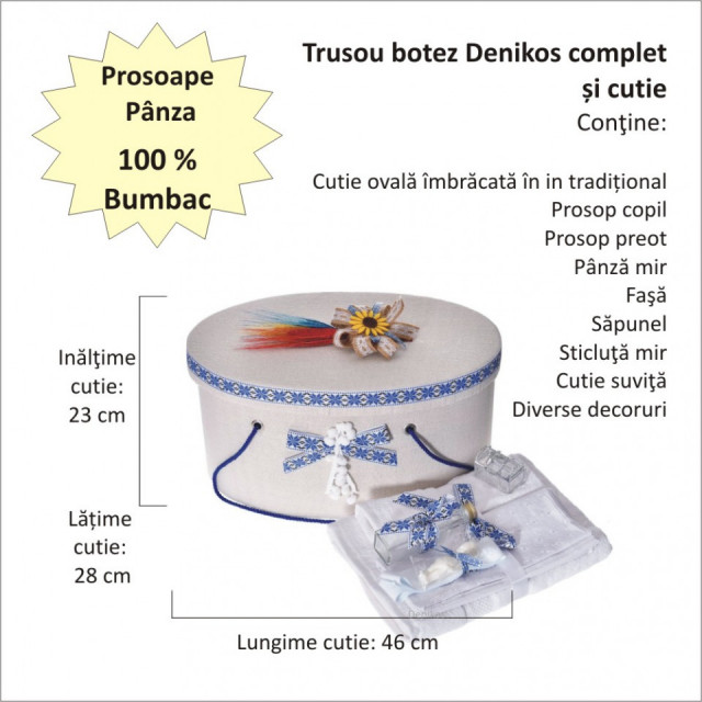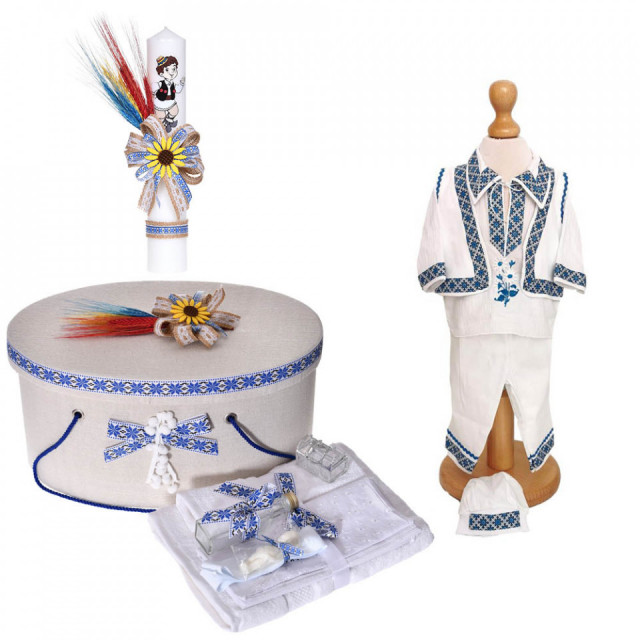 Set special creat pentru ceremonia de botez. Setul este alcatuit din trusou complet, o cutie pentru transportul trusoului si a hainutelor de botez, o lumanare botez decorata tradional si un costum traditional baiat realizat din materiale de cea mai buna calitate (100% bumbac).
