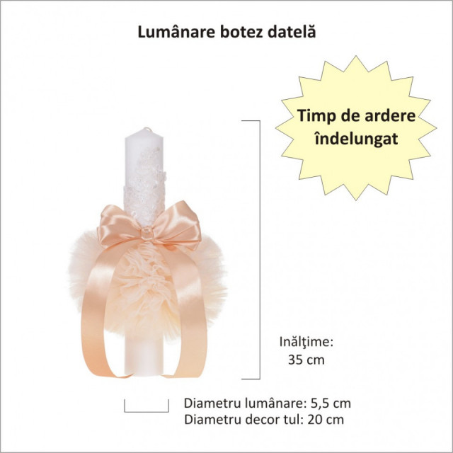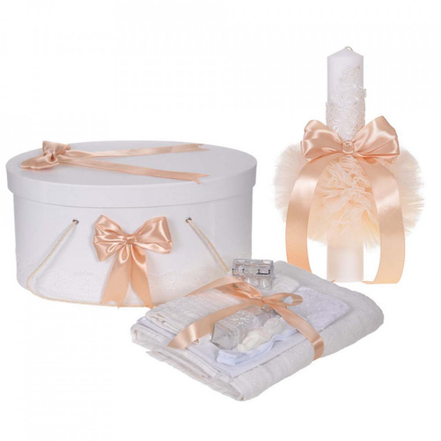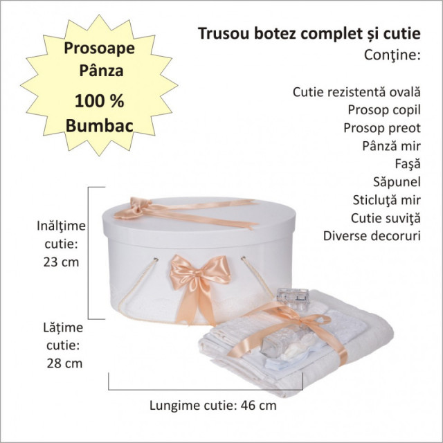 Set special creat pentru ceremonia de botez. Setul este alcatuit din trusou complet, o cutie pentru transportul trusoului si hainutelor de botez si o lumanare de botez decorata elegant cu dantela si fundita asortata.
