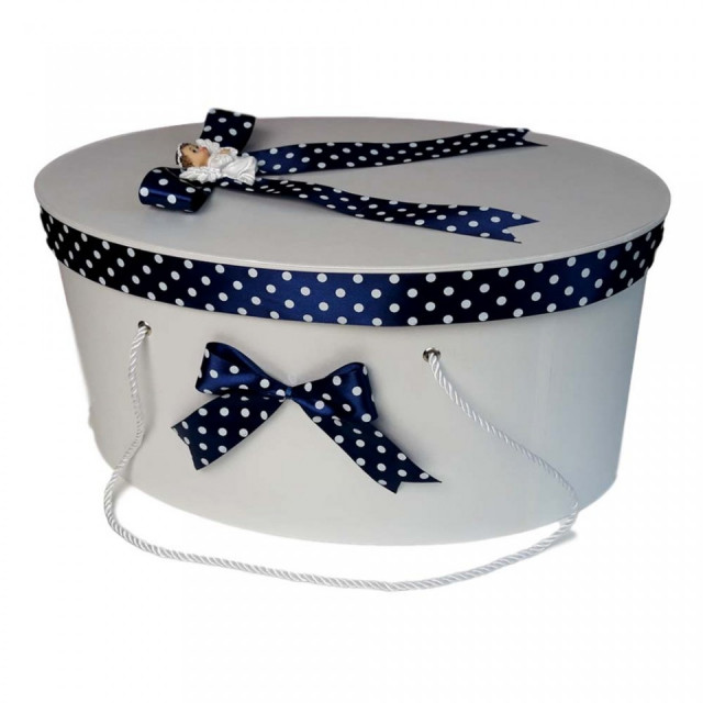 Cutia are forma ovala si este realizata din carton gros, rezistent. Poate fi utilizata dupa botez ca si cutie de depozitatre a jucariilor sau a amintirilor dragi.