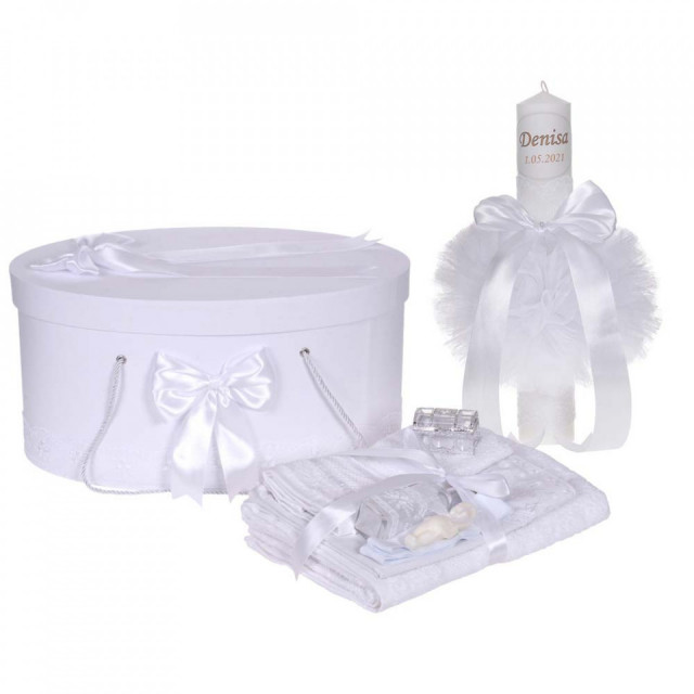 Set special creat pentru ceremonia de botez. Setul este alcatuit din trusou complet, o cutie pentru transportul trusoului si hainutelor de botez si o lumanare botez personalizata cu numele copilului si / sau data evenimentului decorata cu dantela si fundita asortata.