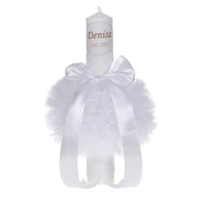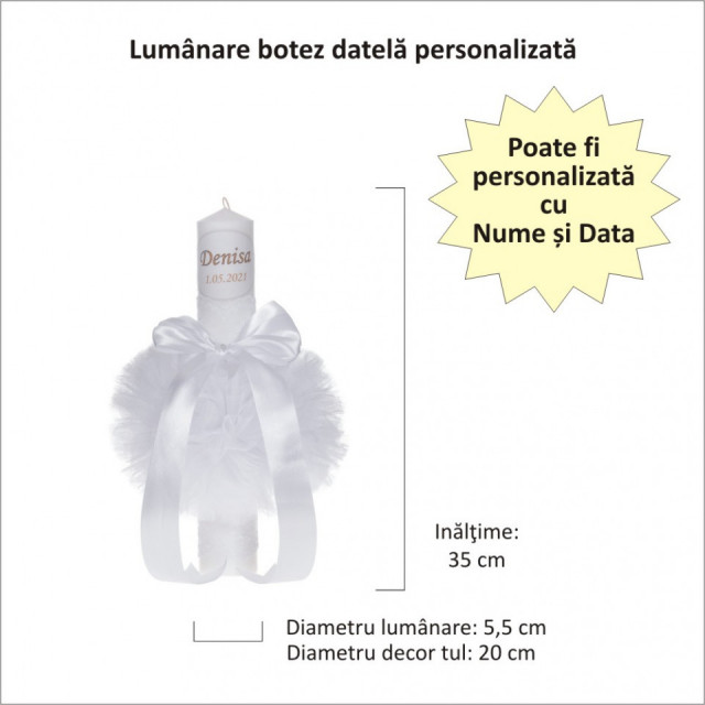 Lumanarea de botez este personalizata cu numele bebelusului si / sau data botezului / nasterii.
