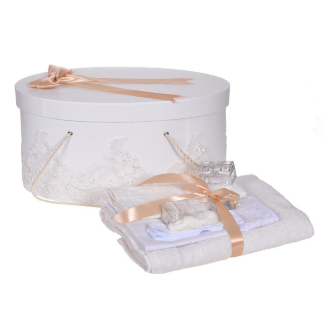 Set trusou botez si cutie trusou, dantela si fundita, decor elegant Crem / Ivoire, Denikos® 848DESCRIERE