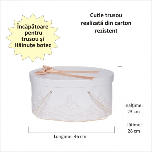 Cutia are forma ovala si este realizata din carton gros, rezistent. Poate fi utilizata dupa botez ca si cutie de depozitatre a jucariilor sau a amintirilor dragi.