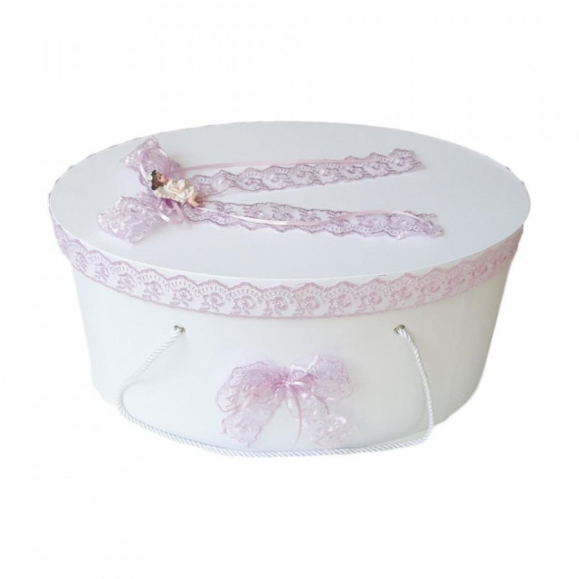 Cutia are forma ovala si este realizata din carton gros, rezistent. Poate fi utilizata dupa botez ca si cutie de depozitatre a jucariilor sau a amintirilor dragi.