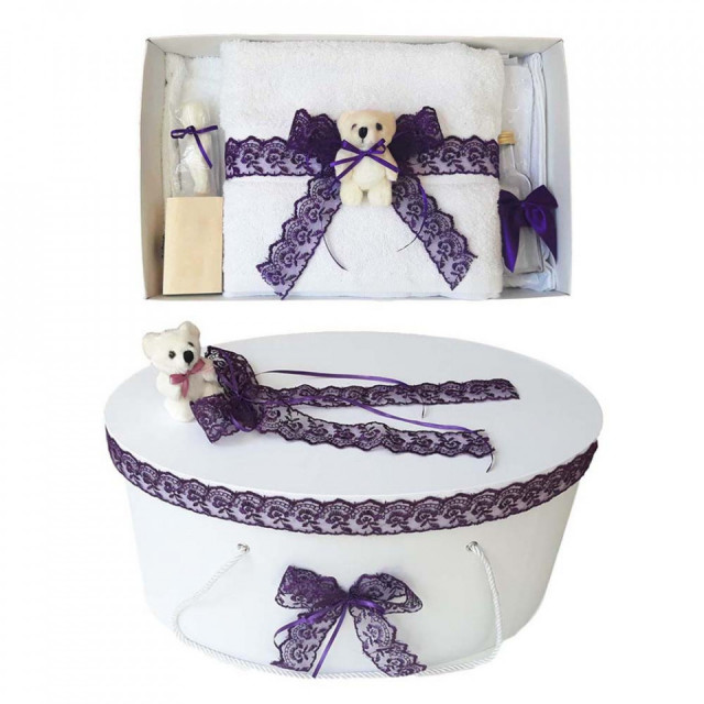 Set trusou botez si cutie trusou, Ursulet, dantela mov, Denikos® 463DESCRIERE