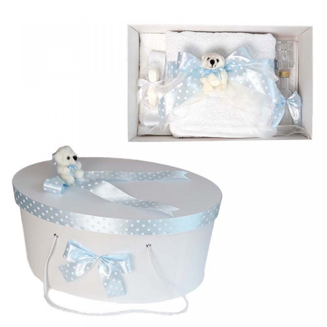 Set trusou botez si cutie trusou, Ursulet, fundita bleu cu buline, Denikos® 24DESCRIERE