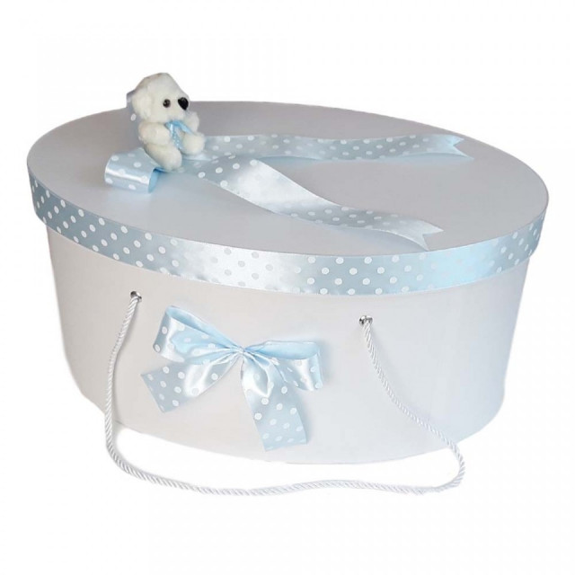 Cutia are forma ovala si este realizata din carton gros, rezistent. Poate fi utilizata dupa botez ca si cutie de depozitatre a jucariilor sau a amintirilor dragi.