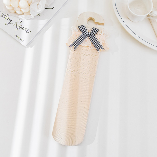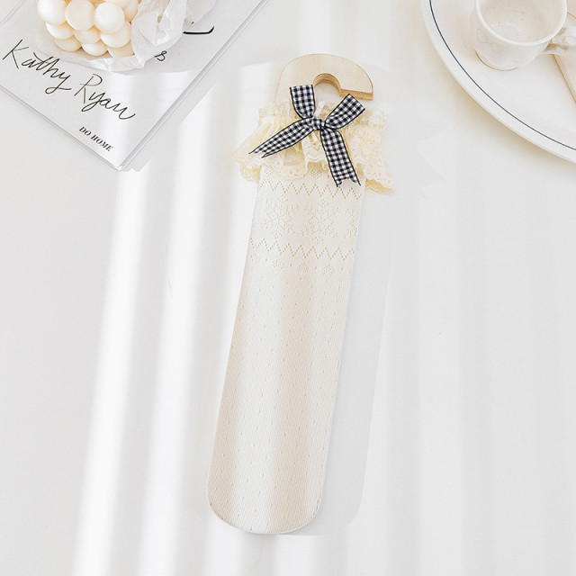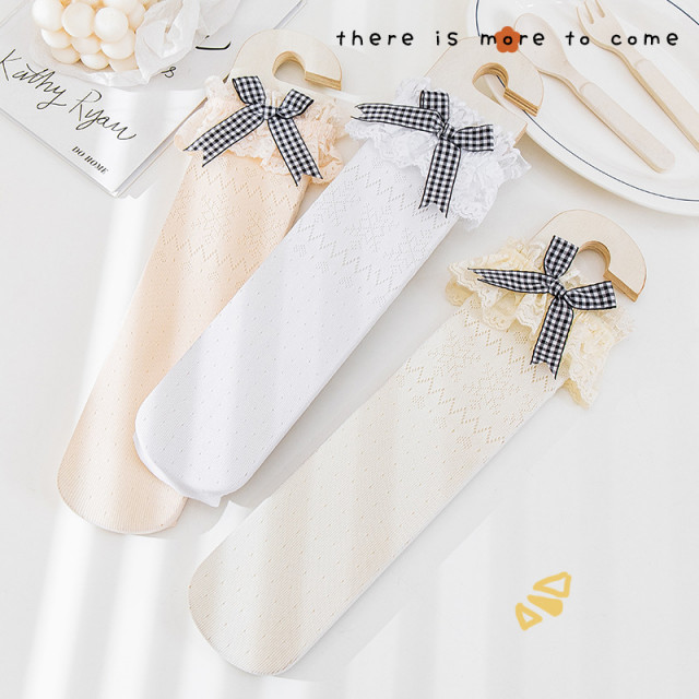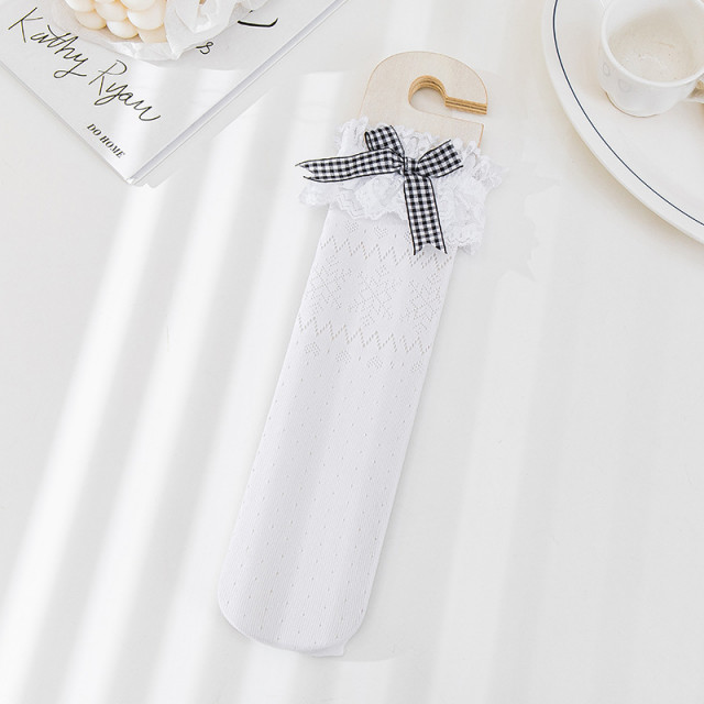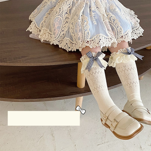Sosete trei sferturi pentru fetite, cu model din tesatura, cu danteluta si fundita aplicate in partea de sus. Ofera eleganta tinutelor micutelor domnisoare.