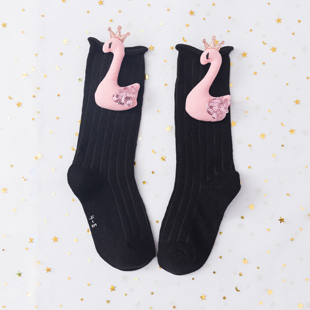 Sosete trei sferturi pentru fetite, cu model din tesatura si cu o lebaduta roz, aplicata intr-o parte. Ofera eleganta tinutelor micutelor domnisoare.