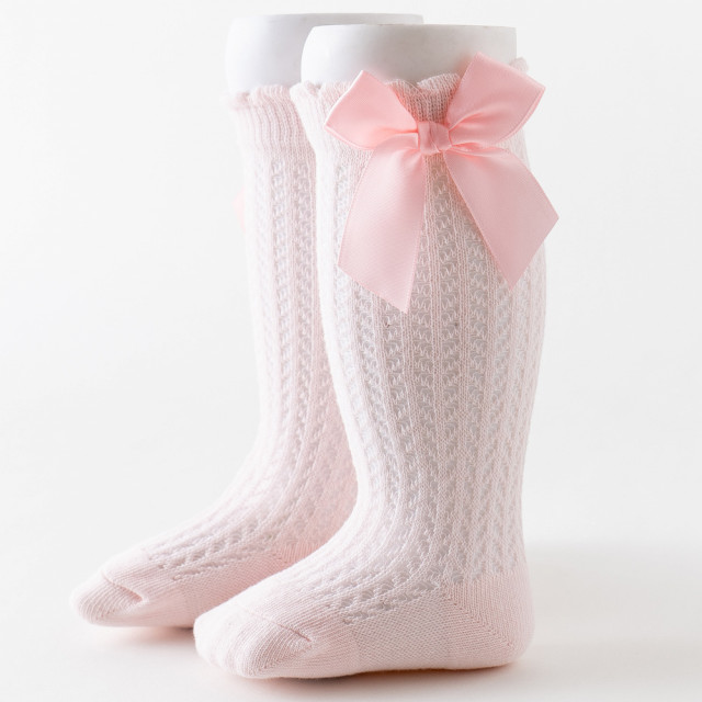 Sosete trei sferturi pentru fetite, cu model din tesatura si cu o fundita din satin aplicata intr-o parte. Ofera eleganta tinutelor micutelor domnisoare.