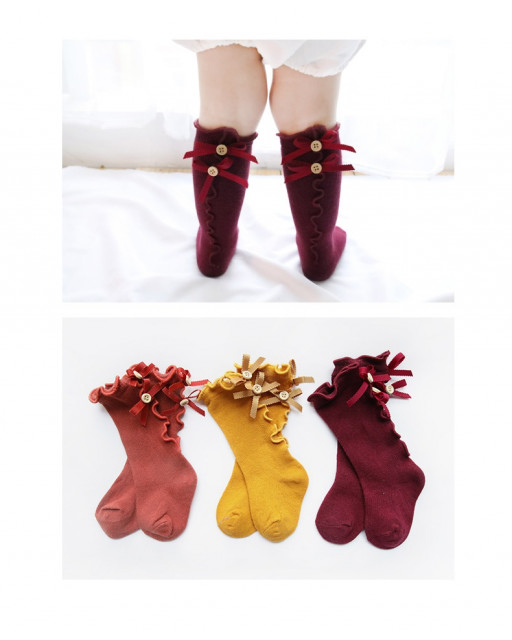 Sosete trei sferturi pentru fetite, cu nasturei si fundite aplicate la spate. Ofera eleganta tinutelor micutelor domnisoare.