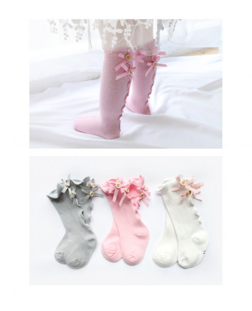 Sosete trei sferturi pentru fetite, cu nasturei si fundite aplicate la spate. Ofera eleganta tinutelor micutelor domnisoare.