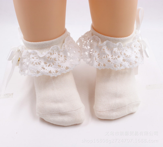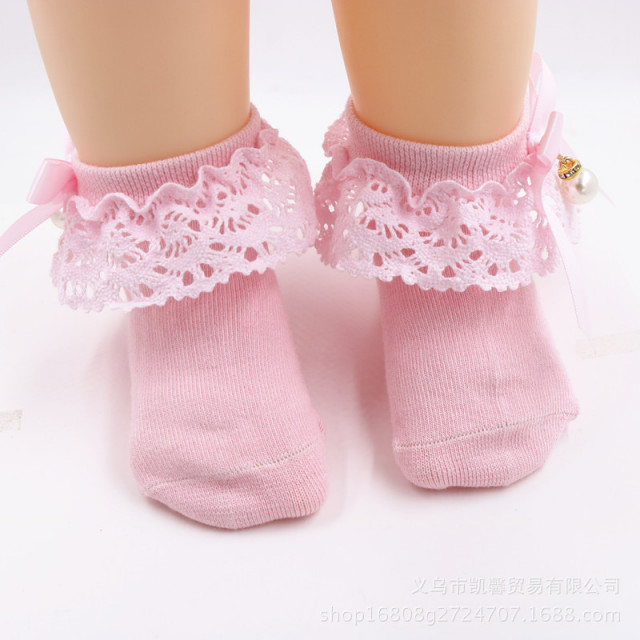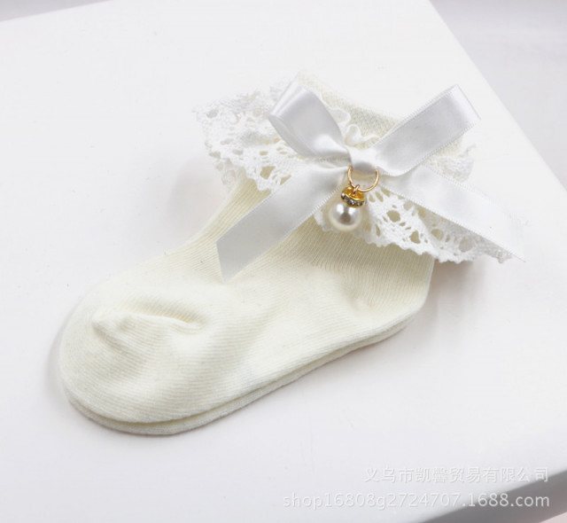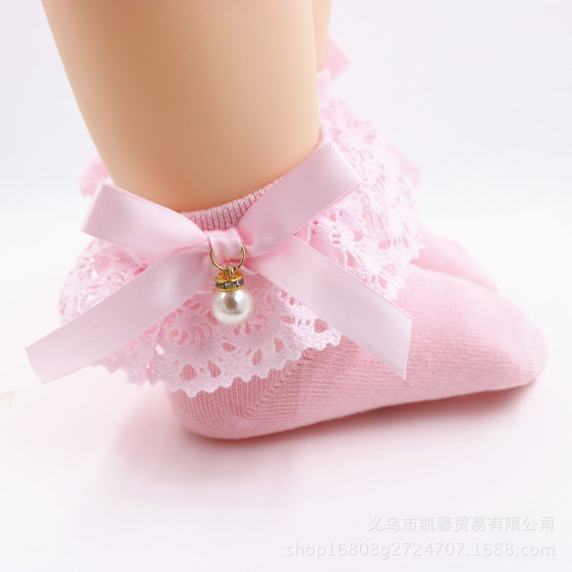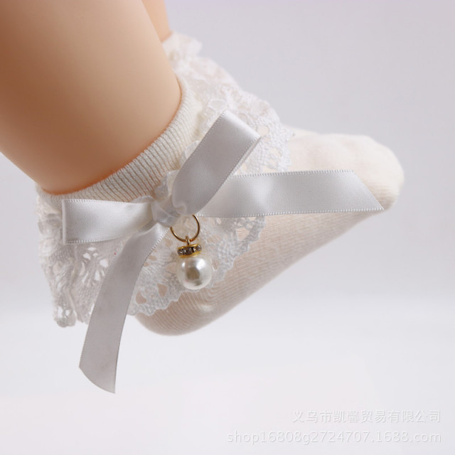 Sosete pentru fetite, prevazute cu un volanas din dantela, pe care este aplicata o fundita din satin si o perluta.
