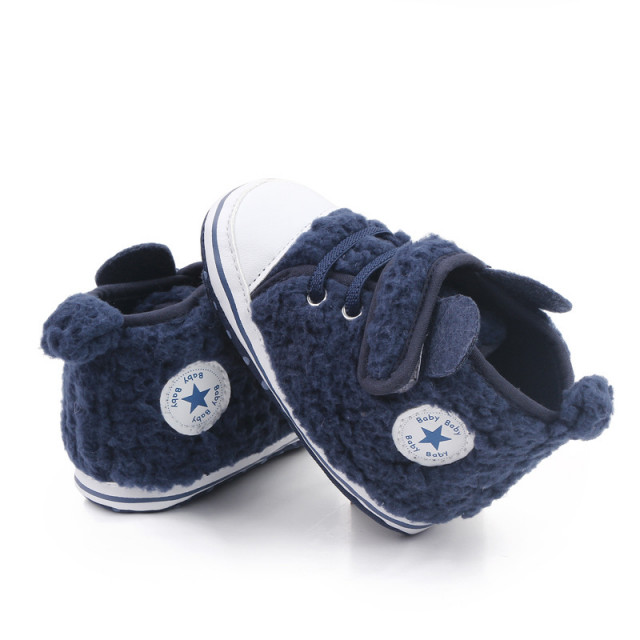 Tenisi pentru bebelusi din material textil, acoperiti cu blanita pufoasa, se inchid cu sireturi din elastic si bareta cu arici intr-o parte.