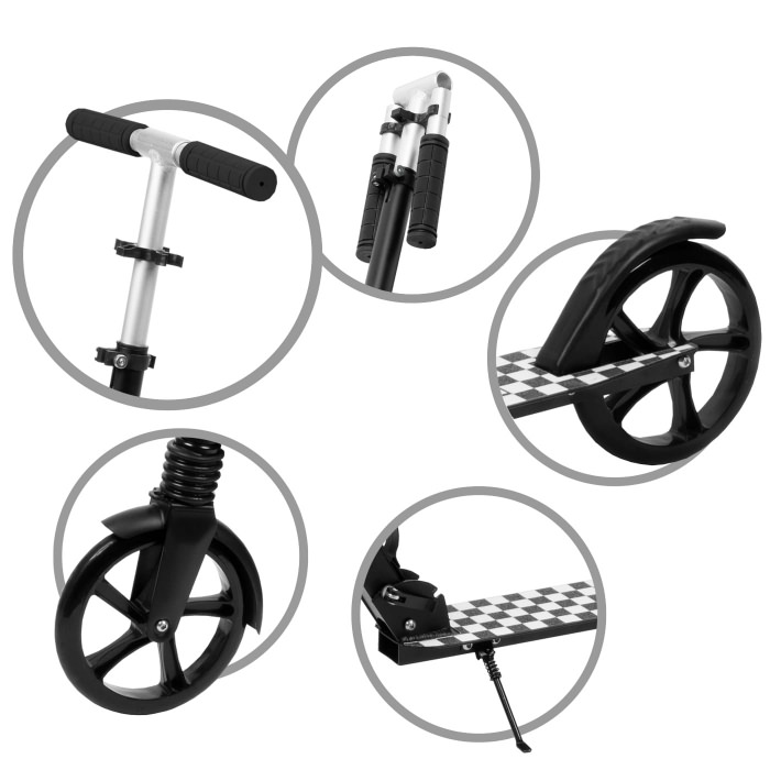 Manerele pot fi pliate si plasate in suporturi speciale. Suspensia din roata din fata elimina vibratiile in timpul mersului. Rulmenti ABEC-7 de inalta calitate. Roti mari si silentioase din poliuretan cu diametrul de 20 cm.