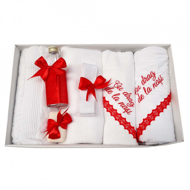 Set special creat pentru ceremonia de botez. Setul este alcatuit din trusou complet ambalat intr-o cutie dreptunghiulara si o lumanare personalizata cu numele copilului decorata cu un glob din tul rosu, dantela, fundita asortata si o jucarie iepuras.