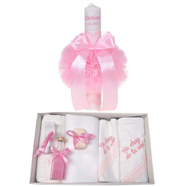 Set special creat pentru ceremonia de botez. Setul este alcatuit din trusou complet ambalat intr-o cutie dreptunghiulara si o lumanare personalizata cu numele copilului decorata cu un glob din tul roz, dantela si fundita asortata.