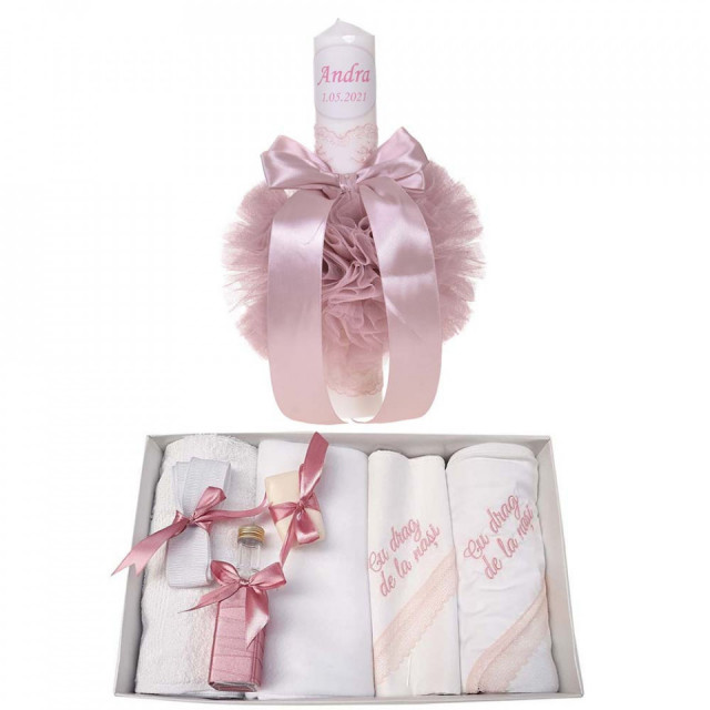 Set special creat pentru ceremonia de botez. Setul este alcatuit din trusou complet ambalat intr-o cutie dreptunghiulara si o lumanare personalizata cu numele copilului decorata cu un glob din tul roz pudra, dantela si fundita asortata.