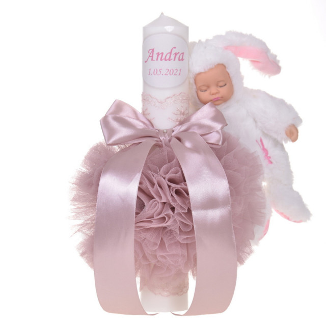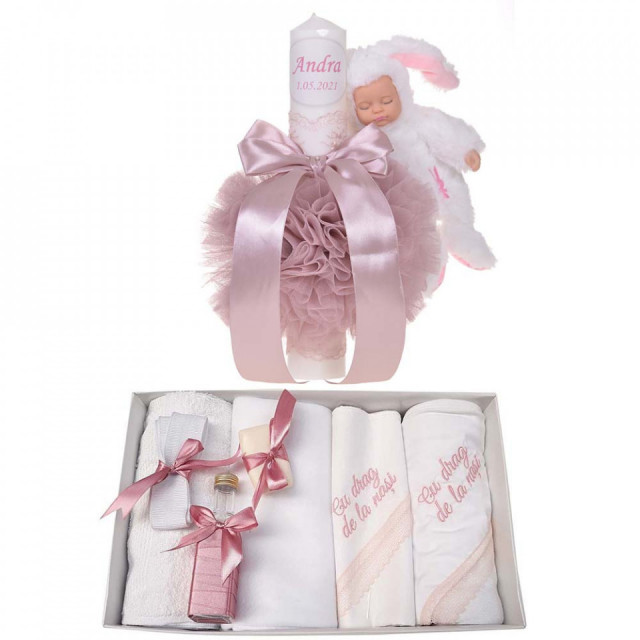 Set special creat pentru ceremonia de botez. Setul este alcatuit din trusou complet ambalat intr-o cutie dreptunghiulara si o lumanare personalizata cu numele copilului decorata cu un glob din tul roz pudra, dantela, fundita asortata si o jucarie iepuras.