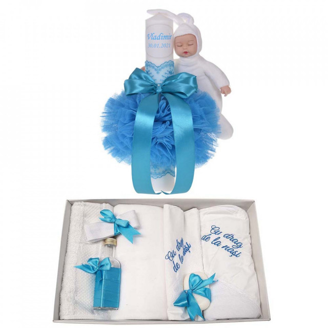 Set special creat pentru ceremonia de botez. Setul este alcatuit din trusou complet ambalat intr-o cutie dreptunghiulara si o lumanare personalizata cu numele copilului decorata cu un glob din tul turcoaz, dantela, fundita asortata si o jucarie iepuras.