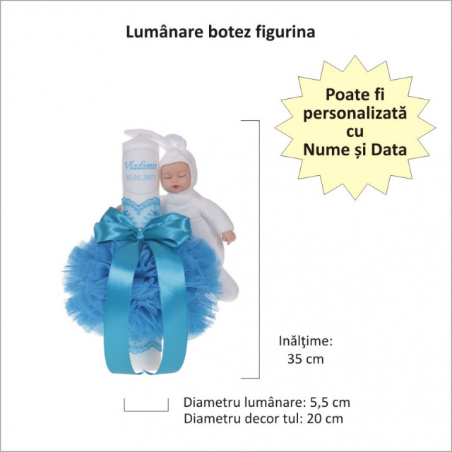 Lumanarea de botez este personalizata cu numele bebelusului si / sau data botezului.