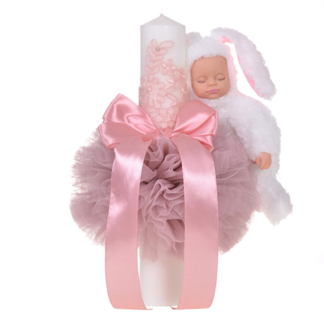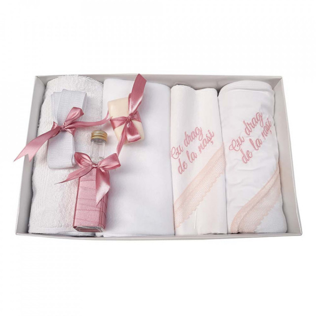 Set special creat pentru ceremonia de botez. Setul este alcatuit din trusou complet ambalat intr-o cutie dreptunghiulara si o lumanare decorata cu un glob din tul roz pudra, dantela, fundita asortata si un iepuras pufos simpatic.