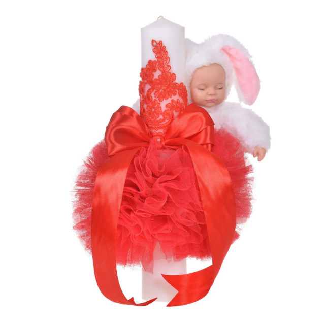 Trusou botez cu mesaj si lumanare eleganta glob cu dantela si iepuras pufos, decor rosu, Denikos® 761DESCRIERE