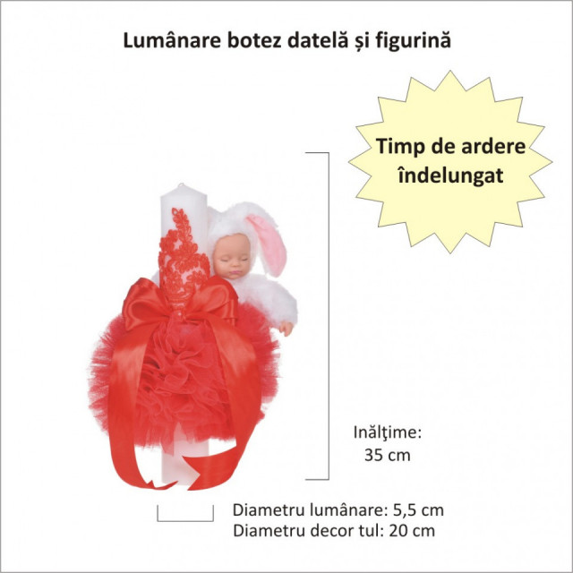 Set special creat pentru ceremonia de botez. Setul este alcatuit din trusou complet ambalat intr-o cutie dreptunghiulara si o lumanare decorata cu un glob din tul rosu, dantela, fundita asortata si un iepuras pufos simpatic.