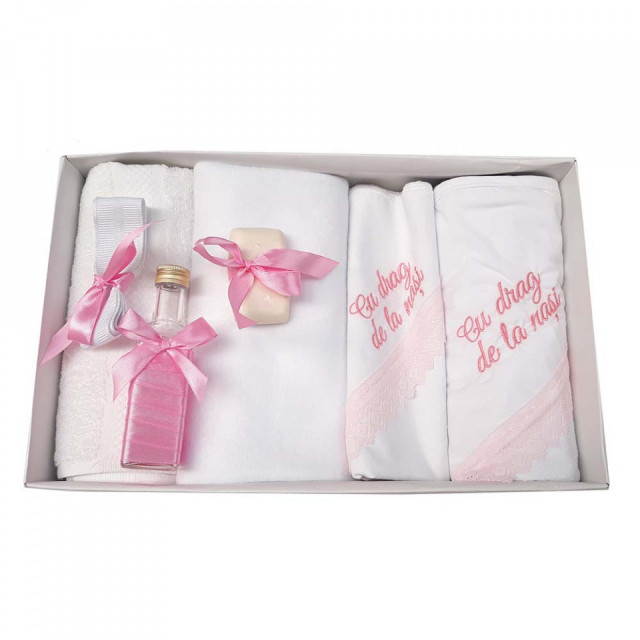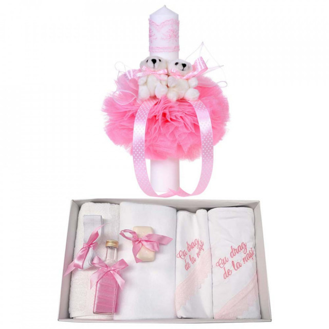 Set special creat pentru ceremonia de botez. Setul este alcatuit din trusou complet ambalat intr-o cutie dreptunghiulara si o lumanare decorata cu un glob din tul roz, 2 ursuleti dragalasi si fundita asortata cu buline.