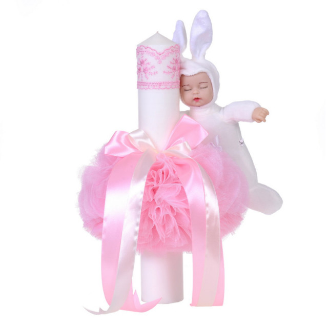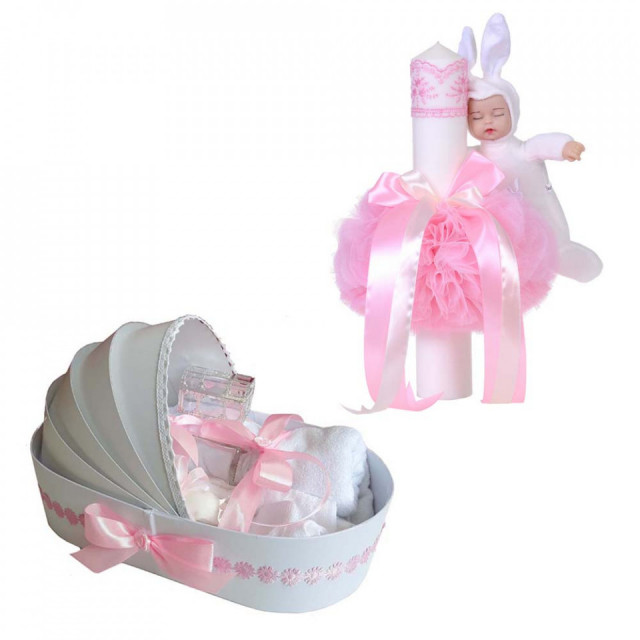 Set special creat pentru ceremonia de botez. Setul este alcatuit din trusou complet ambalat intr-o cutie tip landou decorat cu floricele si o lumanare decorata cu un glob din tul roz si o jucarie iepuras.