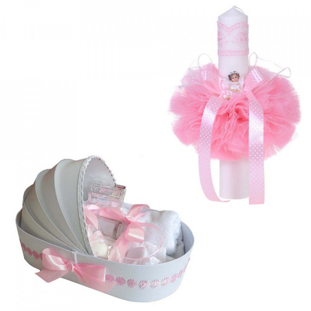 Set special creat pentru ceremonia de botez. Setul este alcatuit din trusou complet ambalat intr-o cutie tip landou si o lumanare decorata cu un glob din tul roz si un ingeras elegant.