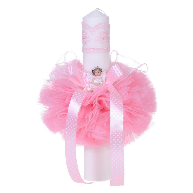 Trusou botez in landou decor floricele si lumanare cu ingeras, decor roz Denikos® 115DESCRIERE