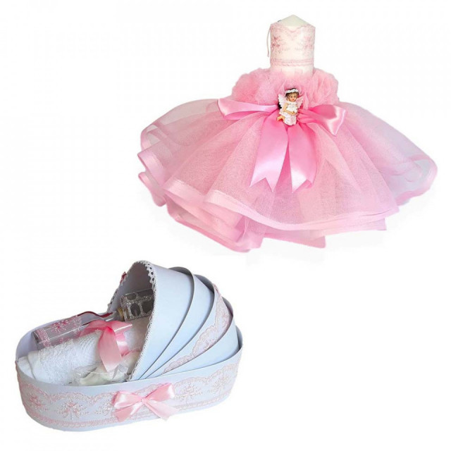 Set special creat pentru ceremonia de botez. Setul este alcatuit din trusou complet ambalat intr-o cutie tip landou si o lumanare decorata cu or rochita din tul roz, dantela si un ingeras elegant.