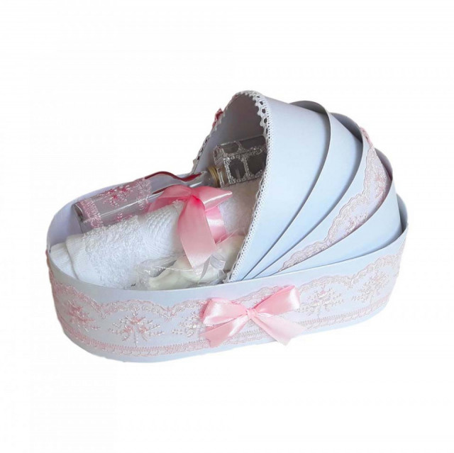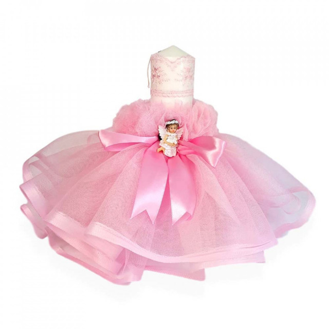 Trusou botez in landou si lumanare cu rochita si ingeras, decor roz Denikos® 167DESCRIERE