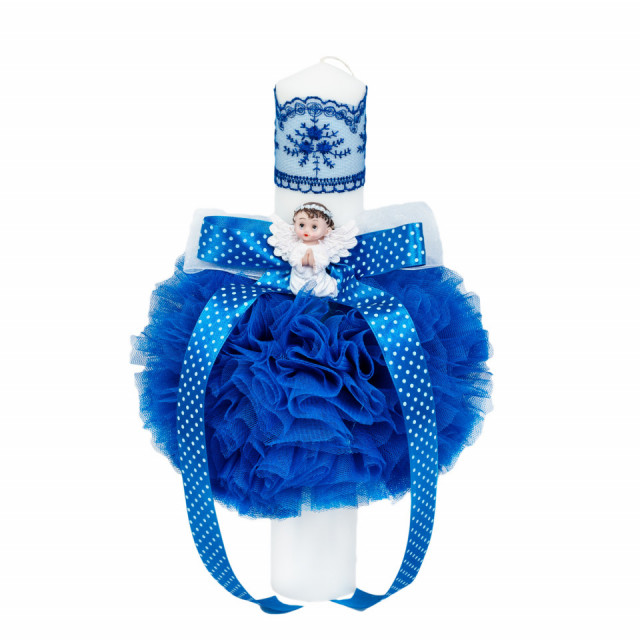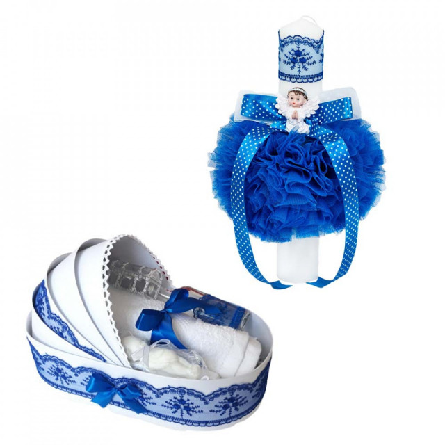 Set special creat pentru ceremonia de botez. Setul este alcatuit din trusou complet ambalat intr-o cutie tip landou si o lumanare decorata cu un glob din tul albastru, dantela si un ingeras elegant.