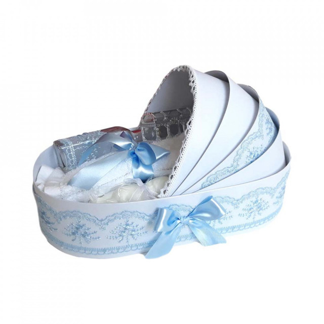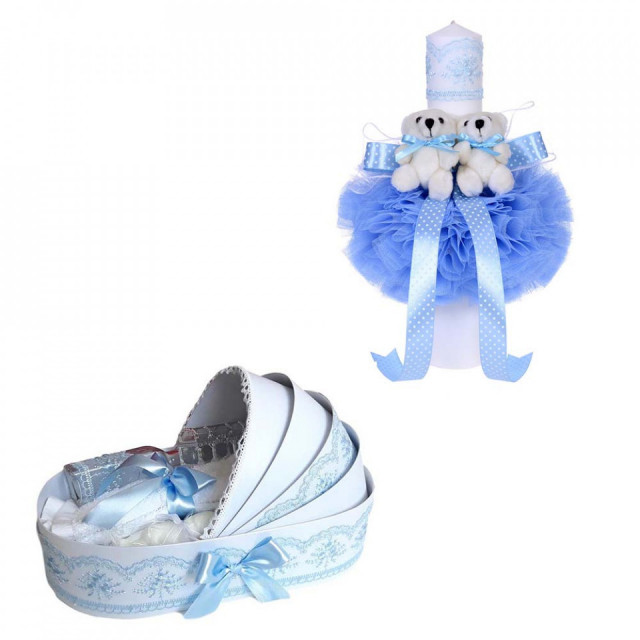 Set special creat pentru ceremonia de botez. Setul este alcatuit din trusou complet ambalat intr-o cutie tip landou si o lumanare decorata cu un glob din tul bleu, dantela si doi ursuleti simpatici.