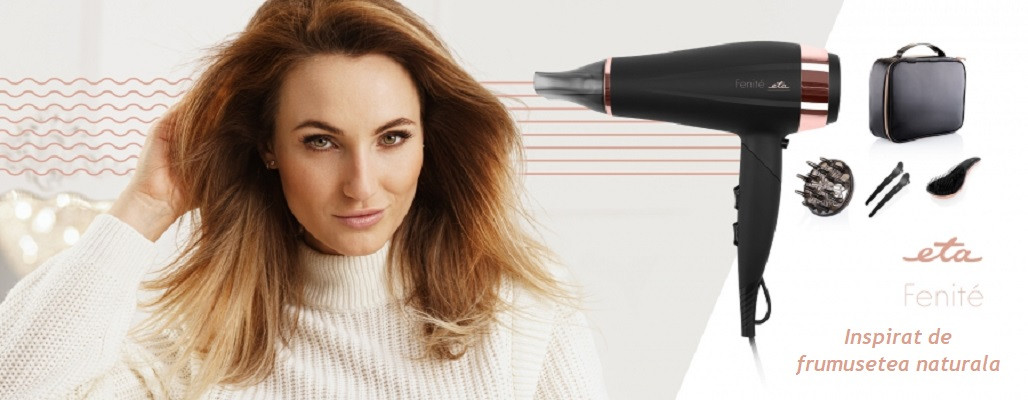 Performanta ridicata de uscare a parului Design practic Consum de energie 2200 W Functie de ionizare COLD AIR SHOT - flux intens de aer rece pentru fixarea coafurii 3 niveluri de temperatura a aerului 2 viteze ale fluxului de aer Indicator luminos de functionare Protectie la supraincalzire Bucla de agatare Maner pliabil pentru o depozitare usoara Operare simpla Geanta de depozitare utila si in calatorii Accesorii si atasamente: o perie de par, 2 agrafe, un concentrator si un difuzor rotativ la 360° Lungimea cablului de alimentare 1,7 m Ingrijirea parului este mult mai usoara atunci cand aveti tot ce trebuie intr-un singur loc. In setul practic ETA Fenite 7320 veti gasi un echipament complet pentru ingrijirea eficienta a parului. Datorita gentii elegante setul este potrivit sub forma de cadou, care garantat multumeste si incanta orice femeie cu parul lung. Ingrijire perfecta pentru parul tau Puternicul uscator de par in design elegant Black Edition de la ETA ofera parului dumneavoastra o ingrijire superioara. Nu numai datorita puterii de 2200 W dar si datorita functiei de ionizare care elimina electricitatea statica din par si il protejeaza de uscare. Daca doresti o coafura dreapta foloseste concentratorul de aer rotativ la 360° . Il puteti inlocui insa cu usurinta cu un difuzor, cu ajutorul caruia veti obtine un volum uimitor. Cu ajutorul butoanelor de pe maner puteti alege intre 3 niveluri de temperatura si 2 viteze ale fluxului de aer. Coafura se poate fixa rapid apasand butonul COLD AIR SHOT uscatorul generand astfel un flux de aer rece. ETA Fenite 7320 este conceput pentru a oferi tot ce este mai bun utilizatorilor sai: forma practica, linii fine si design elegant in negru cu detalii roz aurii, maner ergonomic care se potriveste perfect in orice mana. Cablul de alimentare cu lungimea de 1,7 m asigura o manevrare usoara si in plus bucla de agatare este foarte practica. Echipament complet pentru o coafura perfecta Pachetul include o perie de par care ofera o pieptanare blanda dar eficienta a parului pe toata lungimea acestuia fara a rupe varfurile. Coafarea va fi usurata de clemele practice pentru fixarea suvitelor. Totul este depozitat intr- o geanta eleganta cu fermoar, care poate fi folosita atat in calatorii cat si acasa.Descriere produs